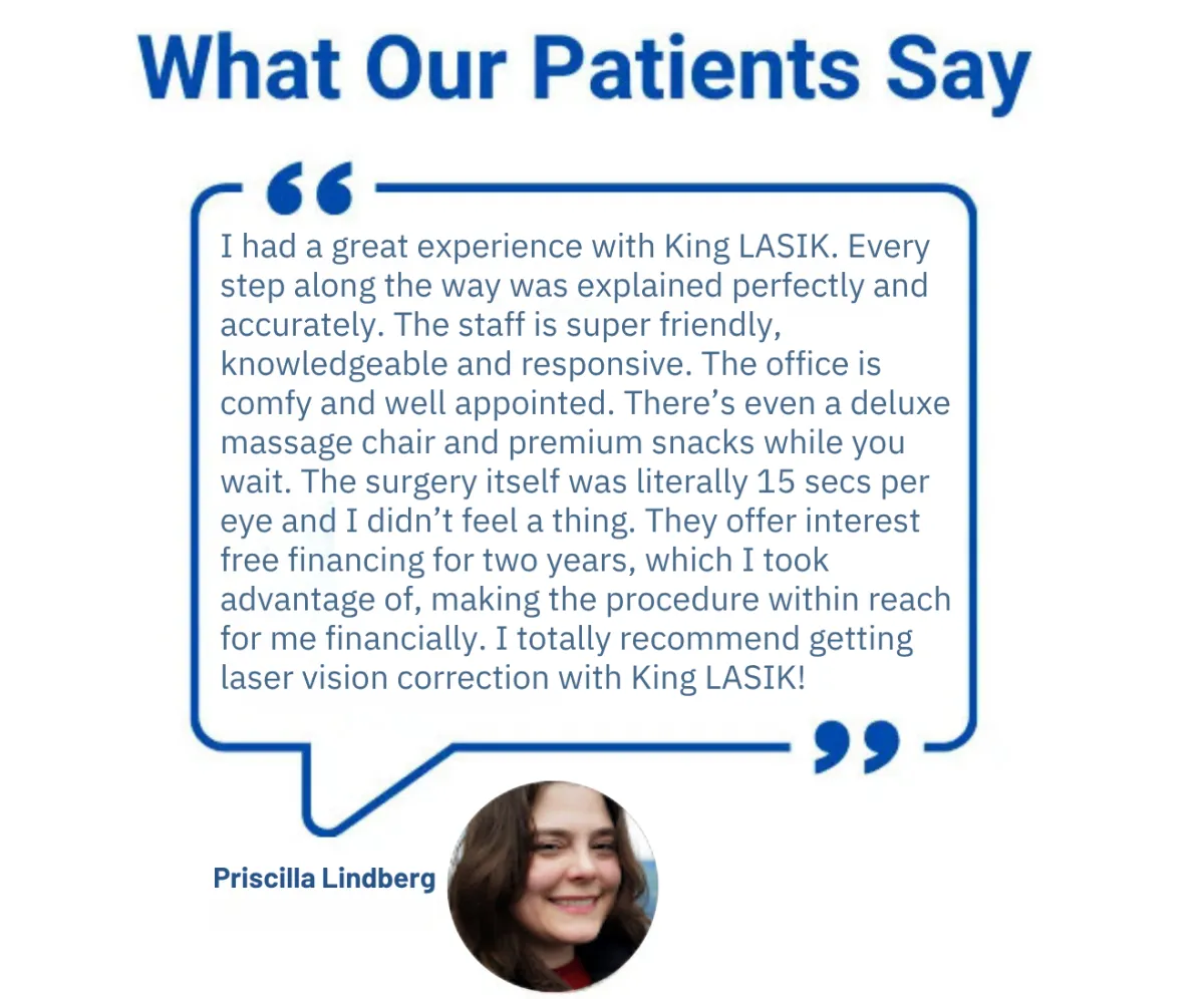 The team at King LASIK, led by Dr. Joseph King, has performed more than 150,000 successful LASIK procedures, and we can’t wait to share this experience with you. We want to help as many people as possible see clearly, without needing to rely as much on eyewear. At King LASIK, you can rest easy knowing you’re getting a safe, affordable, and reliable surgery performed by experts with a long history of excellence!